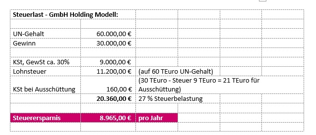 Neulich kam ein Einzelunternehmer zu mir, Gewinn € 90.000. Er war frustriert, weil er gefühlt nur noch Steuern zahlt, (immerhin knapp € 30.000) und seine Zeit mit Verwaltungskram verbringt. Wir haben ihm geholfen, mit unserem GmbH-Modell fast € 9.000 Steuern jährlich zu sparen. Jetzt ist er happy. Den Verwaltungsaufwand haben wir zum größten Teil für ihn erledigt, so dass er sich voll und ganz auf seinen Job konzentrieren kann. Und wenn sein Unternehmen wächst und mehr Gewinn macht, bleibt die Steuerlast überschaubar.